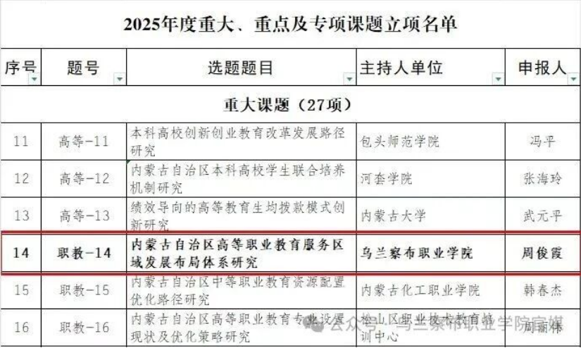 内蒙古自治区教育厅公示了内蒙古自治区教育科学研究“十四五”规划2025年度课题立项名单。经内蒙古自治区教育科学规划领导小组批准,我院周俊霞副院长主持的《内蒙古自治区高等职业教育服务区域发展布局体系研究》课题成功立项重大课题。