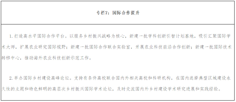 ——加强高水平国际合作。支持国内高校与“一带一路”沿线国家高校开展粮食安全、农业政策交流、种质资源交换、农业技术推广、农业对外投资促进、农业合作规划等相关科研交流活动,开展农机、种子、农药、化肥和农产品加工等优势农业产能合作研究。